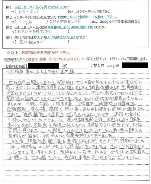 友人・知人が住宅を購入する時は米内さんを紹介し、購入前に必ず住宅検査をしてもらうよう強く勧めたいと思っている。
