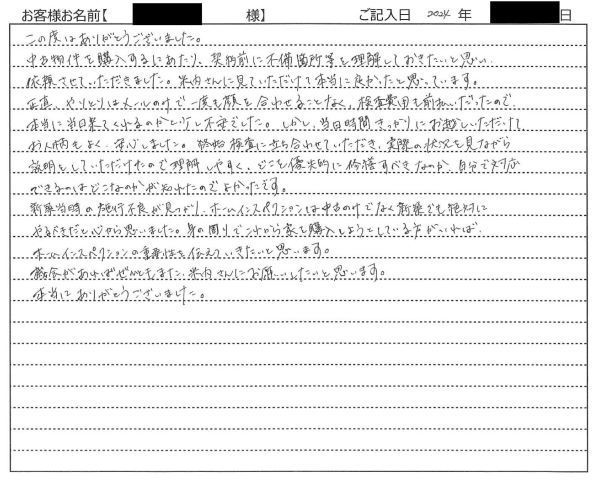 常にお客様にせかされ、説明を理解したかどうかも確認せず施工していた事を、深く反省しております。